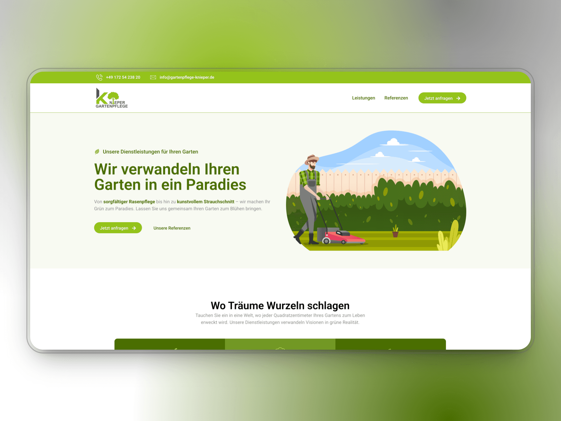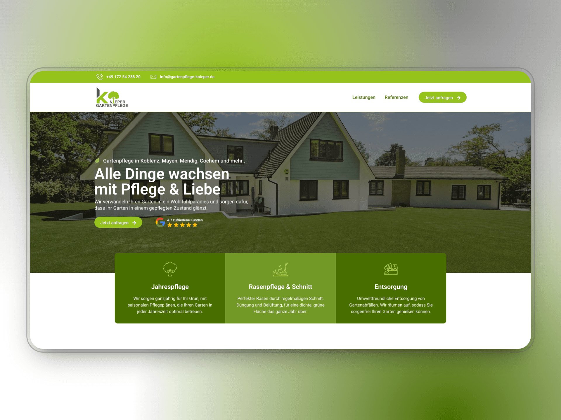Gartenpflege Knieper erhält mit dem neuen Webauftritt erstmals eine professionelle digitale Präsenz. Die Website schafft Vertrauen, macht Leistungen sichtbar und dient als zentrale Anlaufstelle für neue Kundenanfragen.