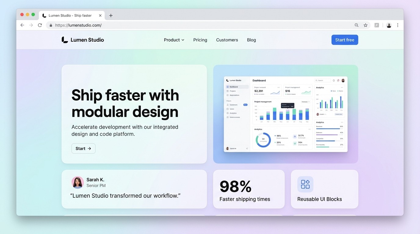 Die erste Bento Welle war stark von Apples Produktseiten inspiriert: große dunkle Flächen, grafische Icons, viel Whitespace. 2026 ist der Stil erwachsener geworden. Drei Dinge fallen auf.